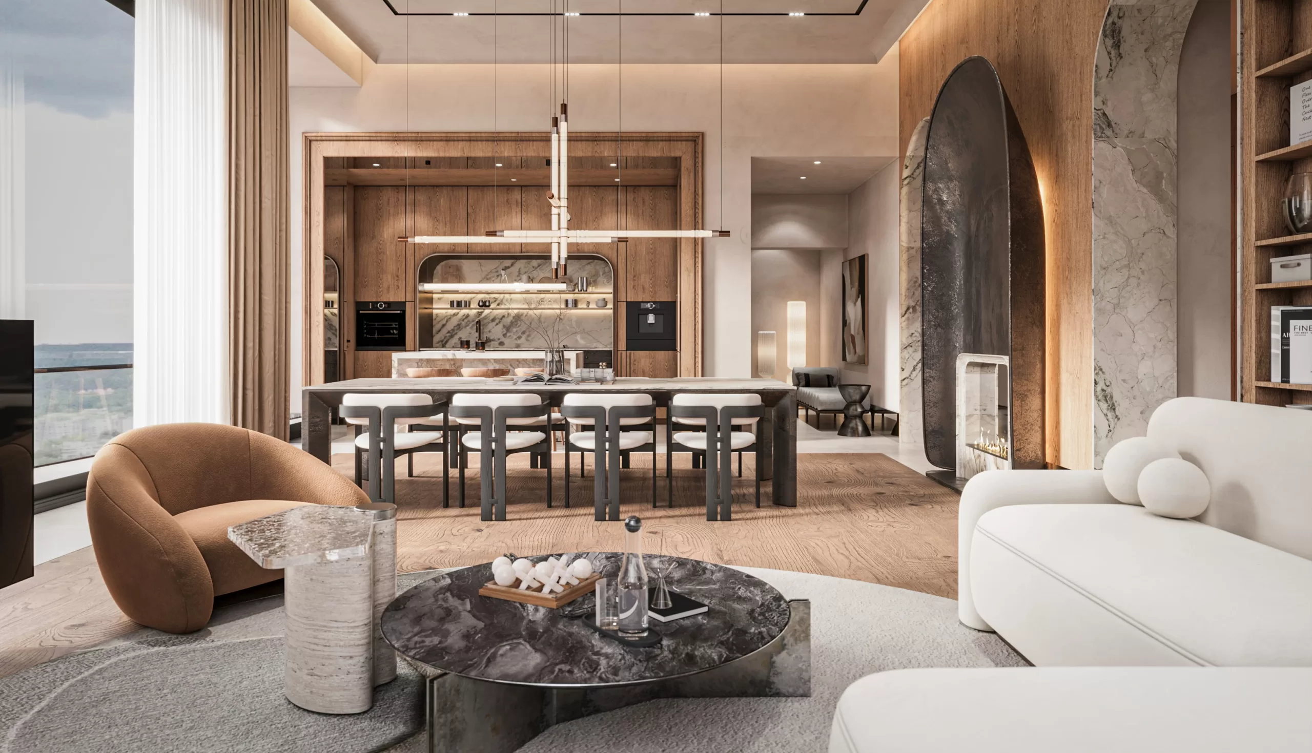Glass-fronted loggias and upper-floor terraces provide additional space for daily relaxation with stunning city views. The loggias serve as private retreat areas, while the terraces expand the living space, offering the opportunity to create outdoor gardens, furnished lounge areas, or even open-air entertainment spaces.